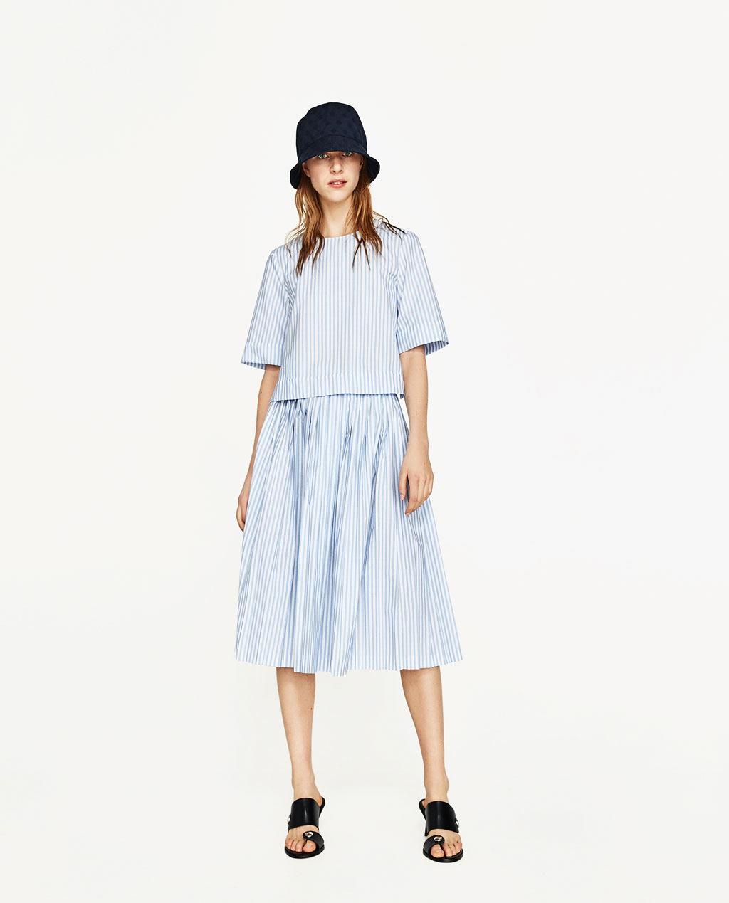 Light blue set with crop-top shirt and midi dress.